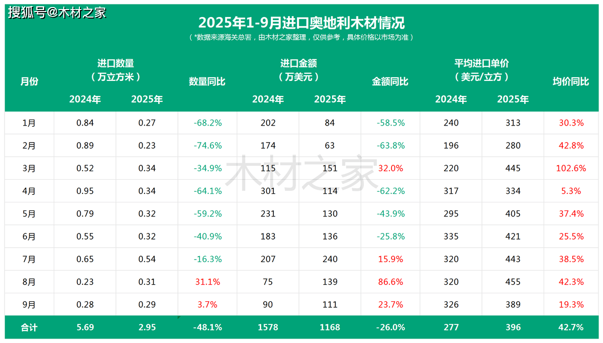 值得防备的是,奥地利木柴涨价已外溢至中邦商场。海闭数据显示,2025年前三季度,奥地利对华木柴出口均价同比抬升42.7%,且每个季度露出稳步上涨态势。此中,3月单月涨幅高达102.6%,1—9月各月均价均高于上年同期。